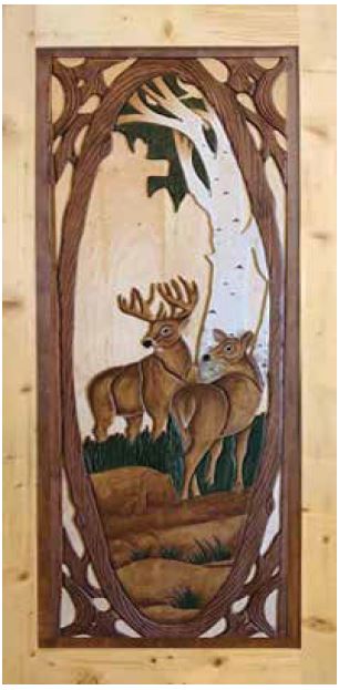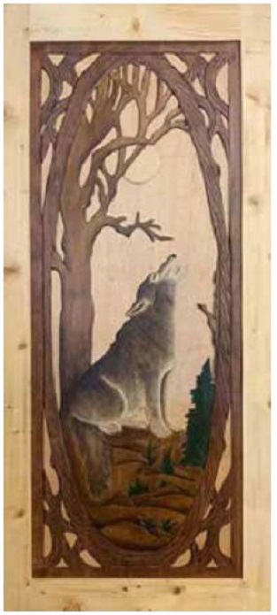 The doors pictured below are made of solid pine and are available in widths of 30", 32" & 36".These are made to order, so you have your choice of the natural finish frame (shown) or a mahogany stain color. These doors will have the carved image on both sides (mirror image). Please allow 8 - 10 weeks from date of order. Available in all wildlife scenes as the screen doors.