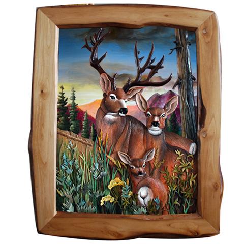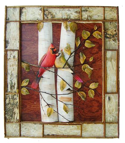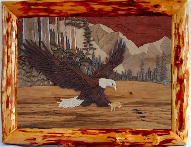 The Intarsia designs are available as a "Special Order" with log frames, flat wood frames, oak leaf frames or birch bark frames. Below are examples of the different style frames. Birch bark frames and oak leaf frames are an additional charge.